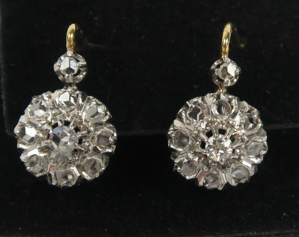 Paire de pendants d'oreilles en or, ornés de diamants taillés en rose. Poids tel : 4 g