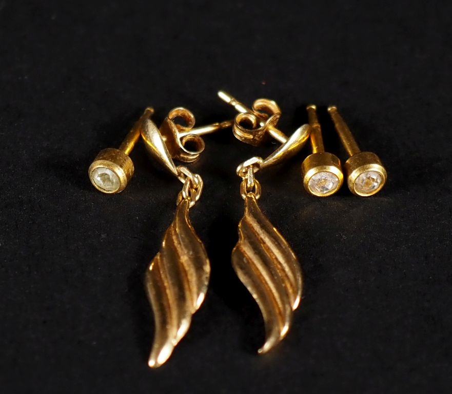 Paire de perce oreilles en or en forme de plume Poids : 1 g On y joint 3 clous d'oreille en or et verroterie Poids tel : 0,80 g