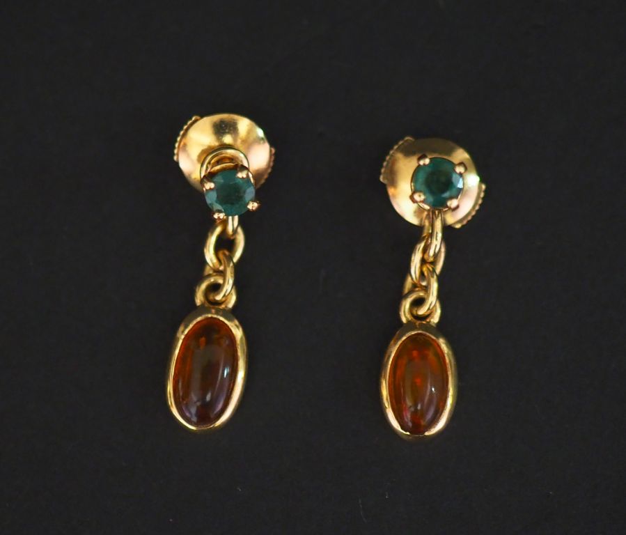 Paire de perce-oreilles en or jaune, sertis d'une pierre verte agrémentée d'une pendeloque ornée d'une pierre orange en cabochon. Fermoir en or jaune, système Alpa. H. 2,3 cm Poids tel. 3,36 g