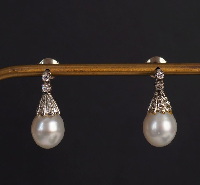 Paire de perces oreilles en or blanc, sertis de deux petits diamants d'où découle un perle en forme de goutte en pendeloque. Attache de la perle sertie de petits diamants. Fermoir en or blanc, système Alpa. H. 2,3 cm Poids tel. 8,29 g