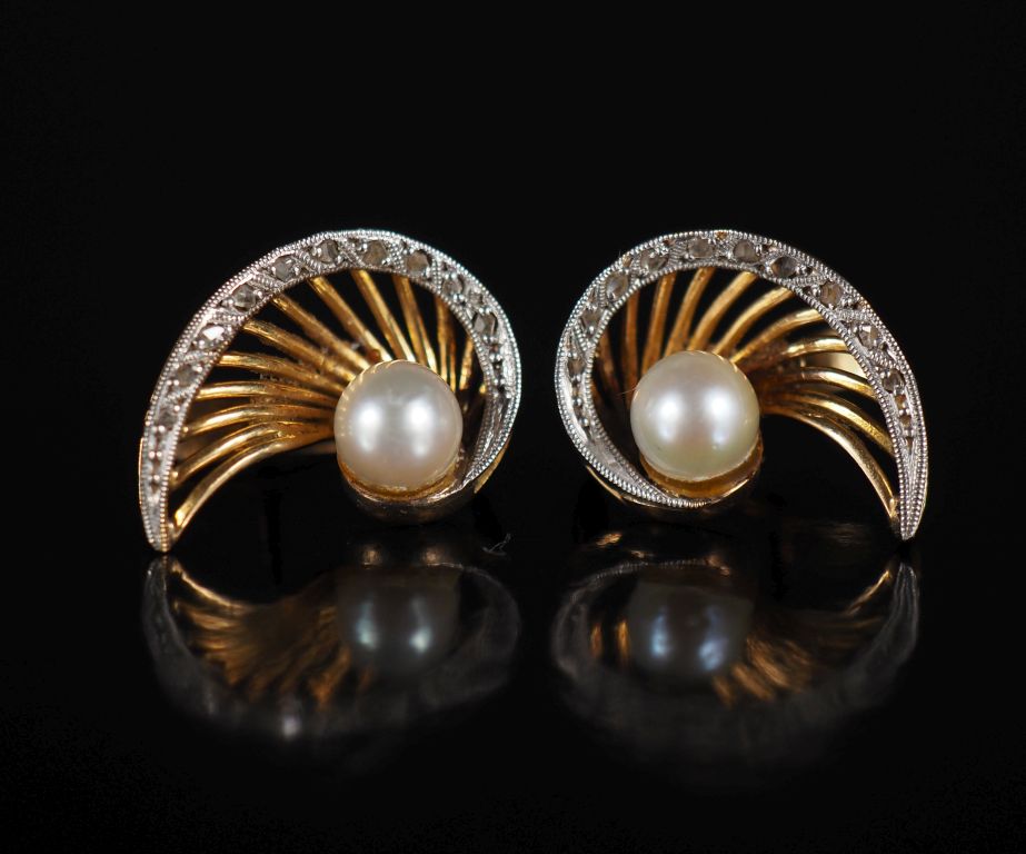Paire de perces oreilles en or, perles et éclats de diamant en forme de console ajourée Poids : 3,80 g