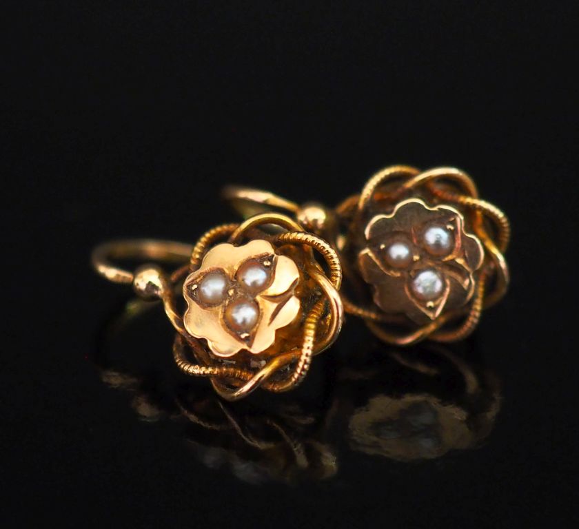 Paire de perces oreilles Napoléon III en or jaune 750, à décor en leur centre d'un trèfle à trois feuilles agrémenté de demi perles blanches. Joli pourtour torsadé et ajouré. Diam. 1 cm Poids tel. 1,59 g (l'un légèrement tordu)