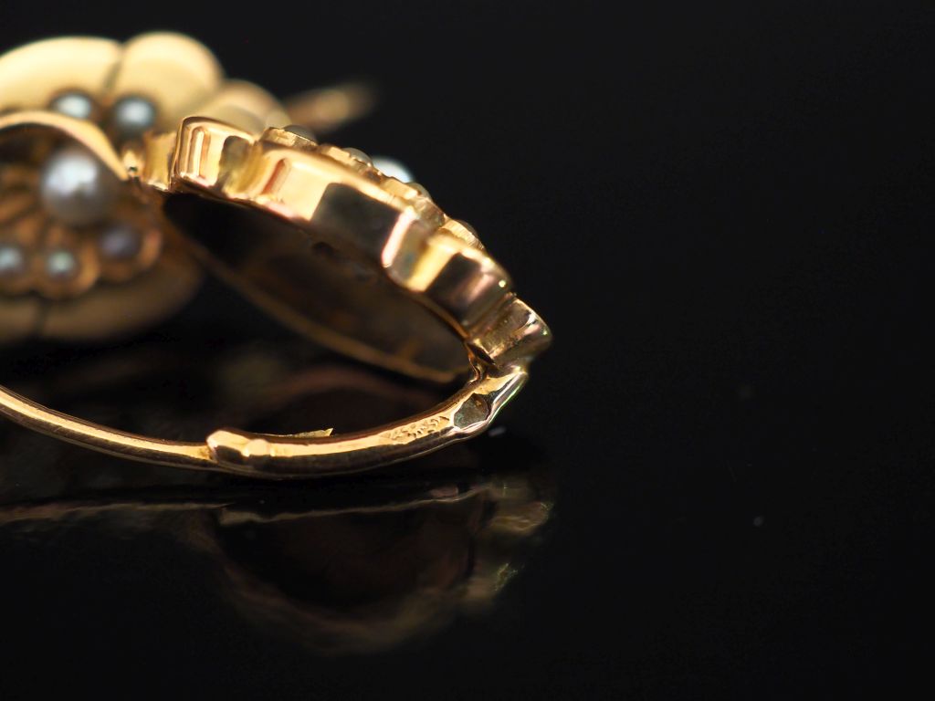 Paire de perces oreilles Napoléon III polylobée en or jaune 750, sertis de petites perles blanches. Dim. du motif : 1,5 x 1,2 cm Poids tel. 2,51 g