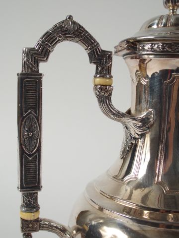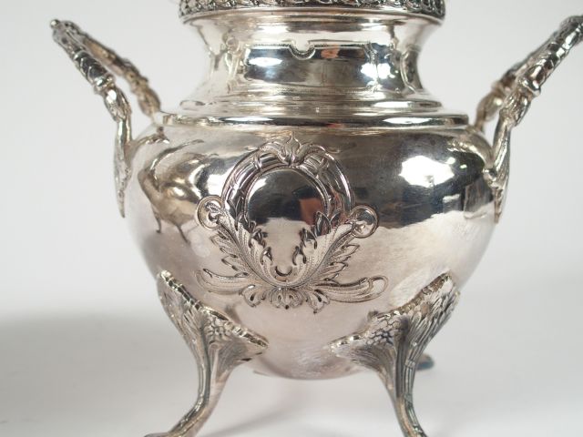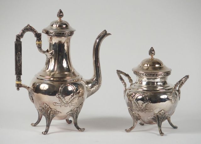 Partie de service à thé de style rocaille en métal argenté, à décor de feuilles d'acanthe, de nœuds de ruban et de cartouches feuillagés.