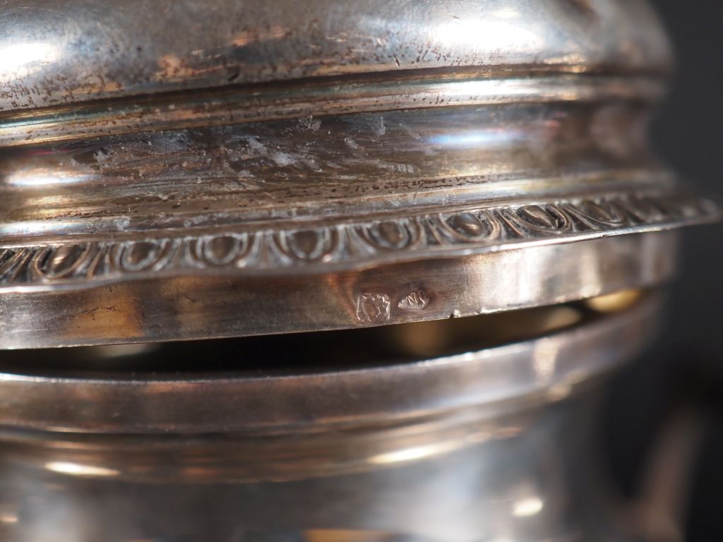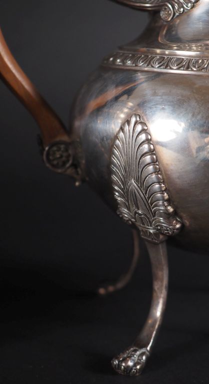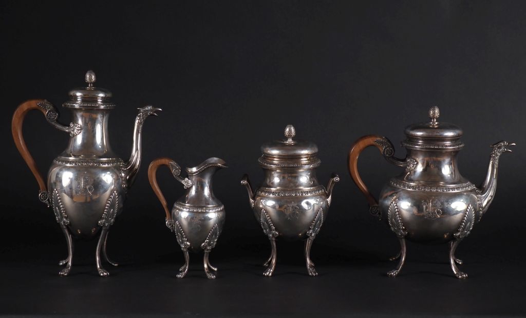Partie de service à thé et à café de style Louis XVI en argent 925, à décor de palme, de laurier, de frises de rais de cœur, becs verseurs figurant des têtes d'aigles. Poinçon Minerve. M.O : N.E Poids tel : 2944 g (petits chocs et enfoncements)