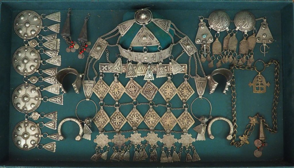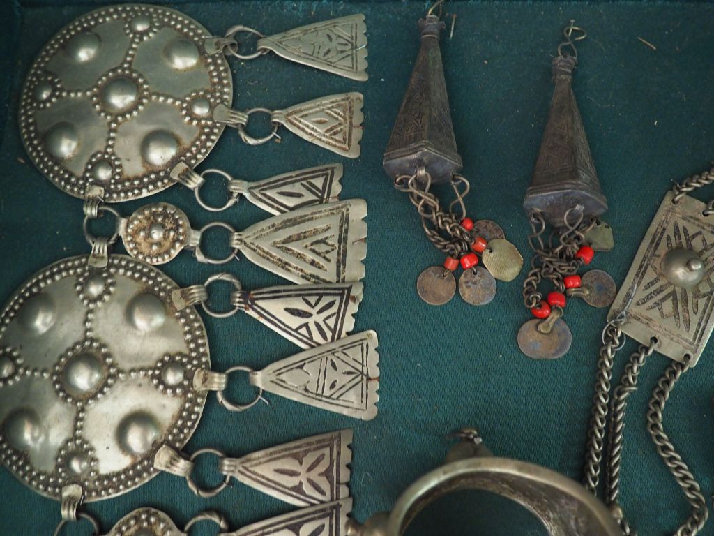 Parure Afrique du Nord en métal. Comprenant notamment un ornement pour la tête, des chevillères, bracelets, boucles d'oreilles, fibules etc … Dans un présentoir.