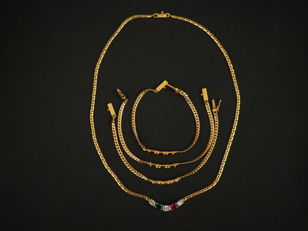 Parure en or jaune et pierres de couleur comprenant : - un collier en or jaune une émeraude et un rubis synthétique - un bracelet or jaune et 5 diamants - un bracelet en or jaune 3 rubis synthétiques et deux diamants - un bracelet en or jaune, 3 émeraudes et deux diamants Poids tel : 31,72 g