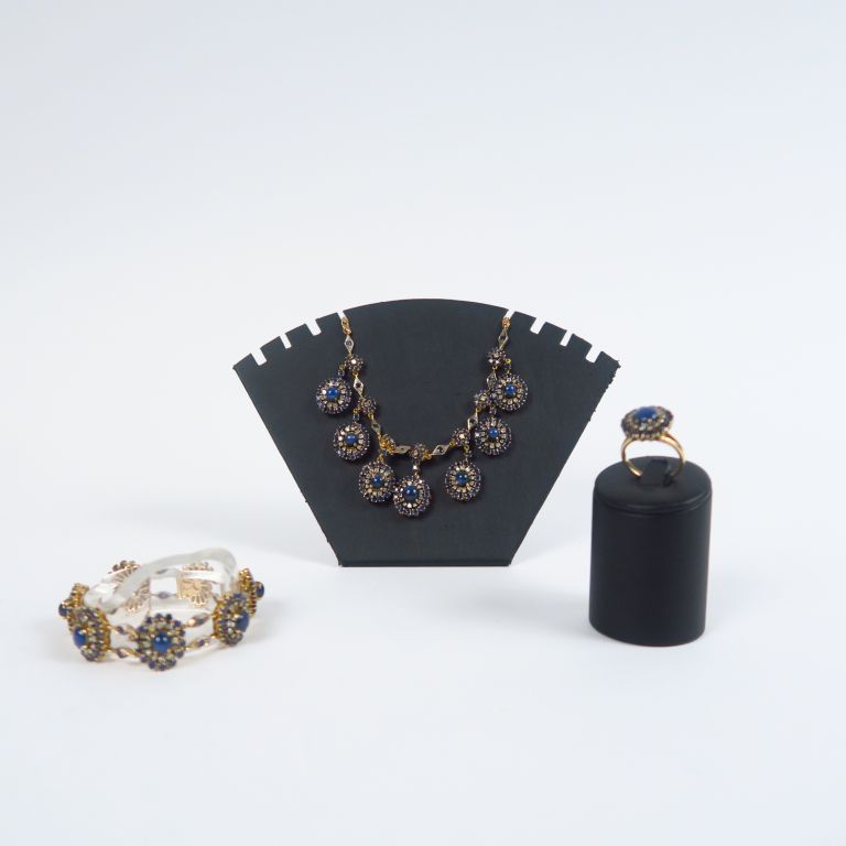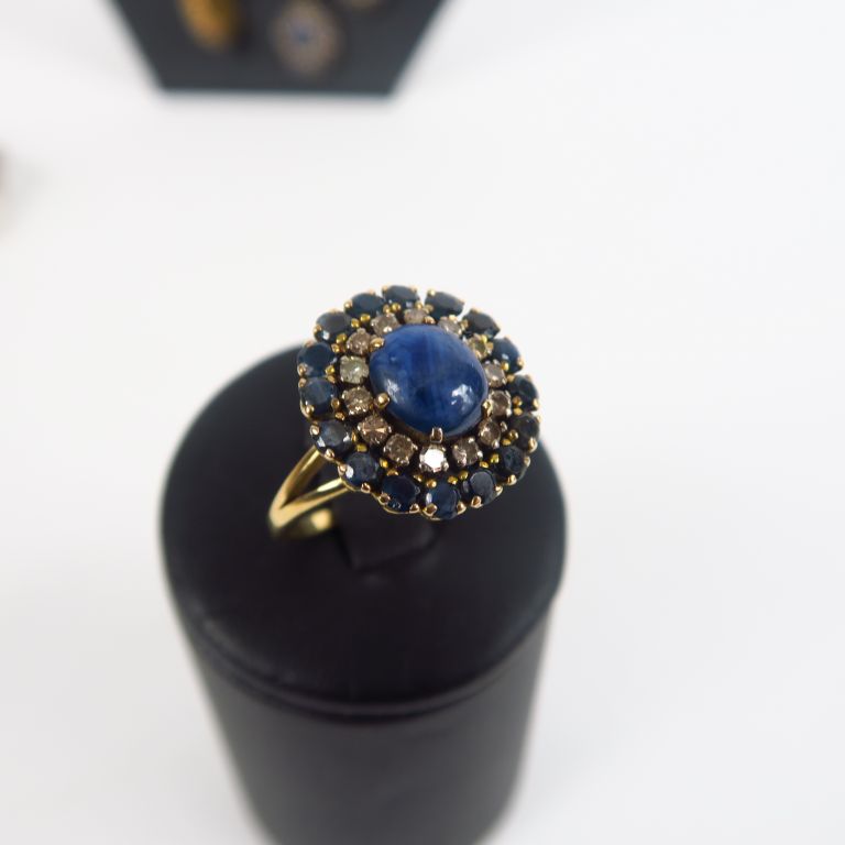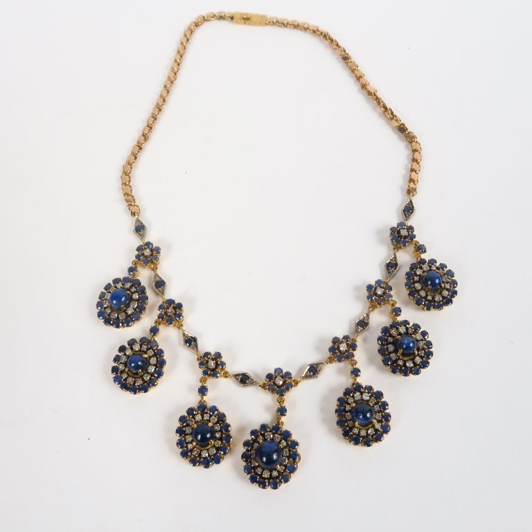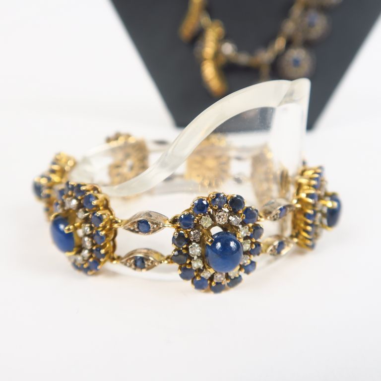Parure en or jaune, saphirs et diamants comprenant : - un collier Poids tel. 57,64 gr - un bracelet Long. 9 cm Poids tel. 44,32 gr - une bague TDD. 58 Poids tel. 7,61 gr
