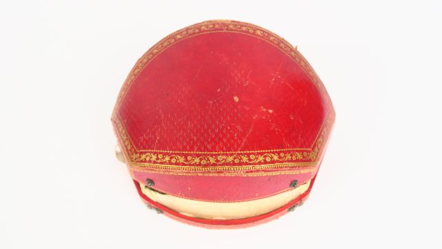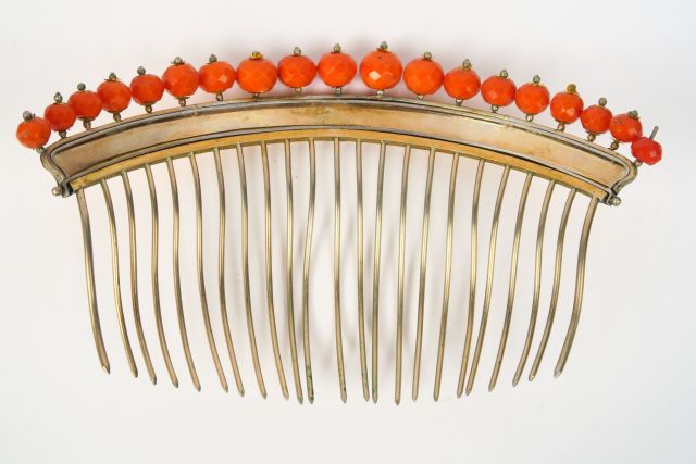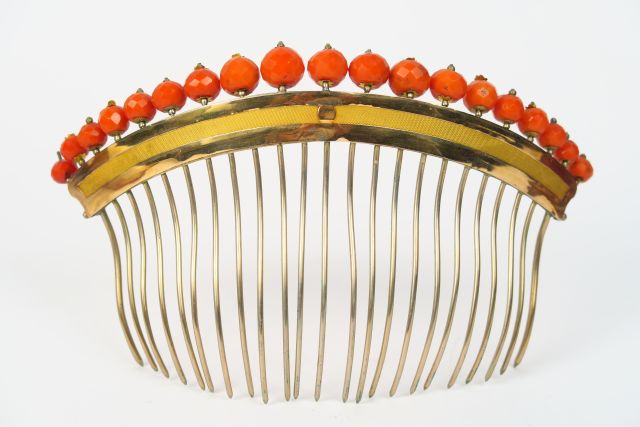 Peigne, première moitié XIXème, en or, métal et perles de corail facetées dans son écrin d'orgine