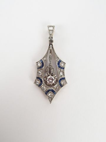 Pendentif années 20 monture platine pavé de diamants et de saphirs calibrés et rehaussé en son centre d'un brillant de 0,20cts environ. Poids tel: 3,2gr
