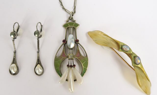 Pendentif Art Nouveau en argent, émail, nacre et pierres à l’imitation de diamants. Avec sa chaîne en argent. On y joint une broche du même style, et une paire de pendants d'oreilles en argent et nacre.