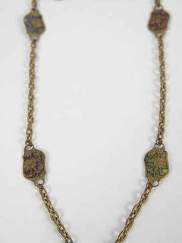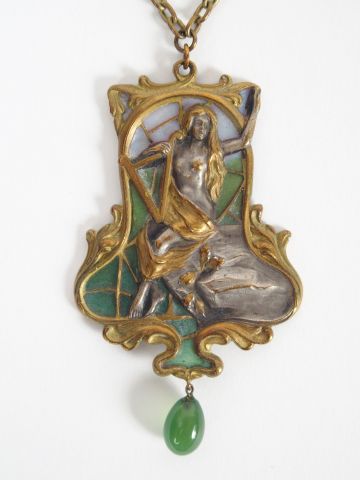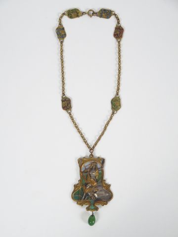 Pendentif Art nouveau en métal, émaillé en plique-à-jour figurant une jeune femme évoquant la Loreley sur son rocher. Chaîne avec six maillons de différentes couleurs en émaux plique-à jour. Probablement Allemagne, vers 1900.