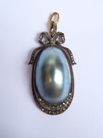Pendentif articulé de style louis XVI en argent, orné d'une nacre et de diamants taillés en rose. (petit manque). poids tel : 12 g. h. 5,5 cm