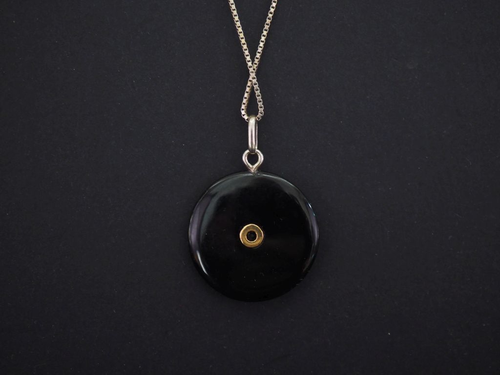 Pendentif circulaire de style Art déco en argent et onyx noir, serti en son centre d'un petit diamant taille ancienne. On y joint une chaine en or blanc 750, maille vénitienne. Diam. 2,5 cm Long. 41,5 cm Poids tel. 6,81 g
