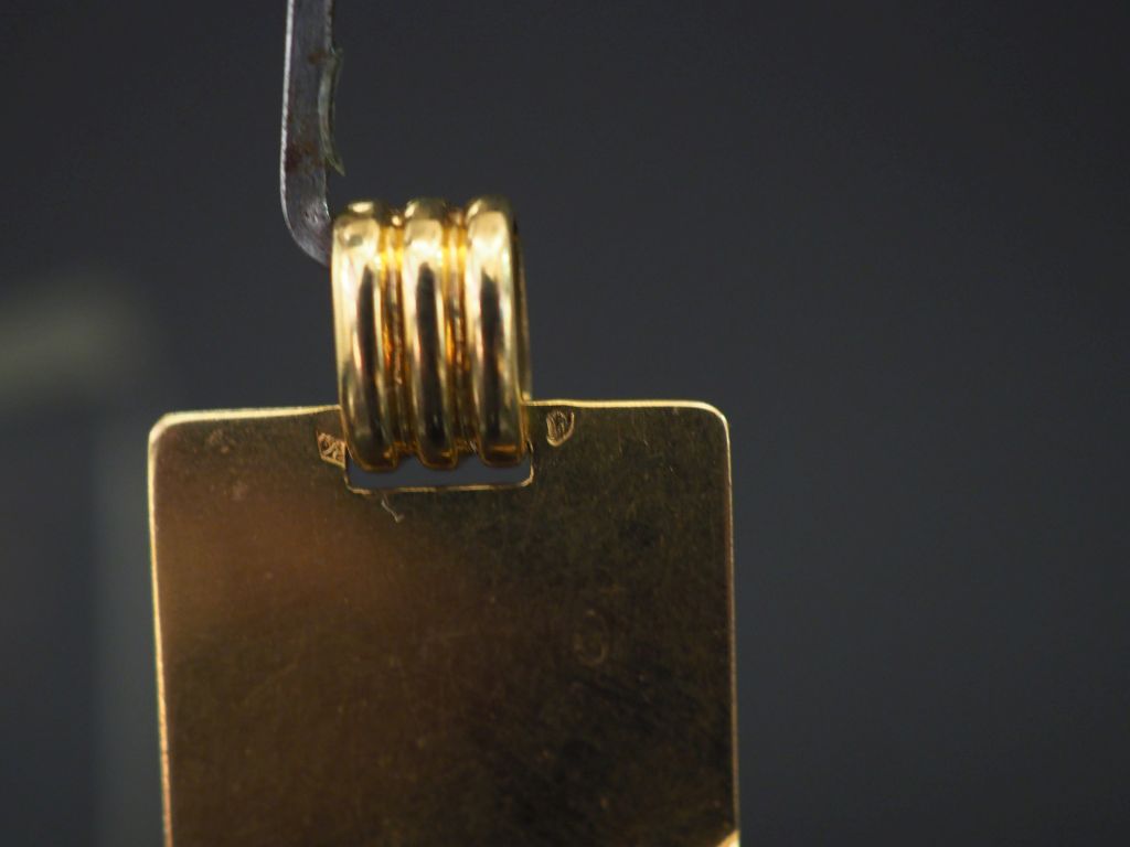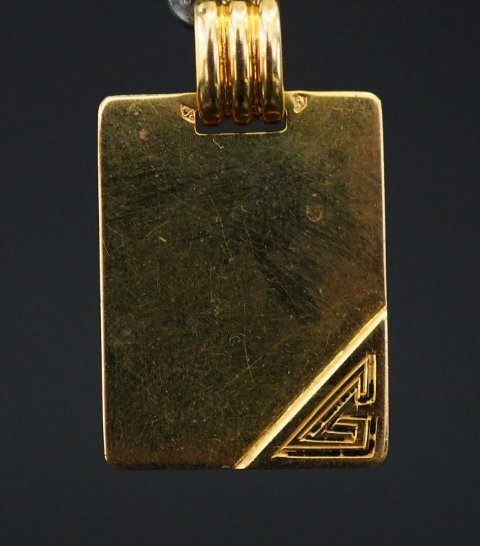 Pendentif de forme rectangulaire en or jaune, à décor de la lettre "G" anciennement émaillée noir. Jolie bélière, à décor de godrons. 2,5 x 2 cm Poids. 7 g
