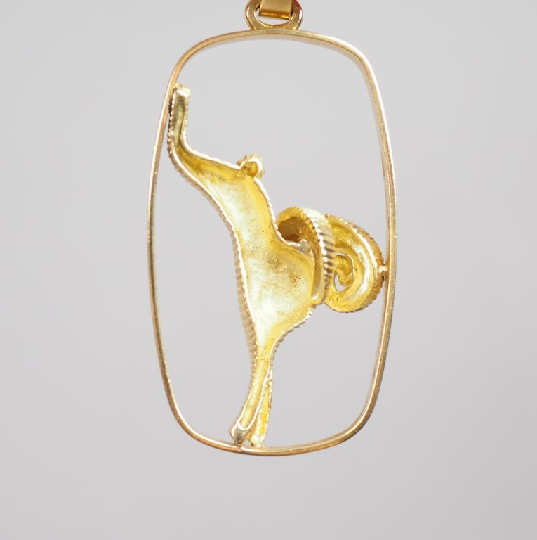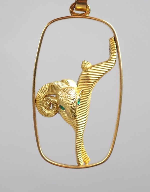Pendentif de style Art déco en or jaune, à décor d'un bélier, les yeux sertis de petites émeraudes. M.O : G.I H. 5,7 cm (sans la bélière) Poids tel. 28,49 g