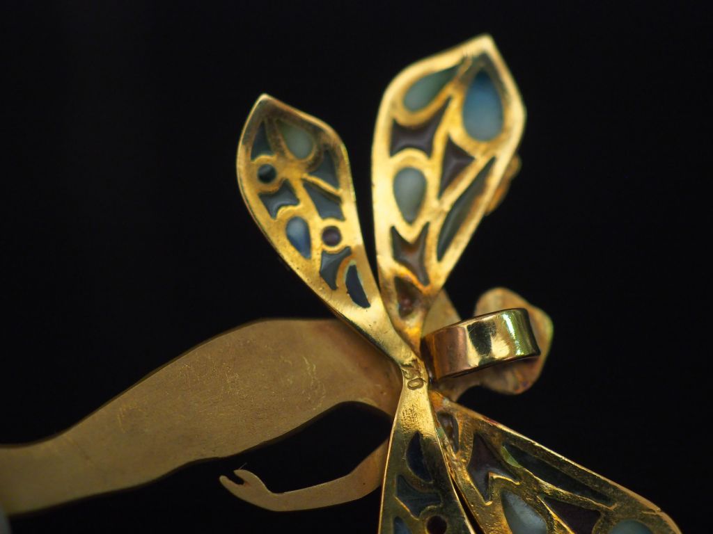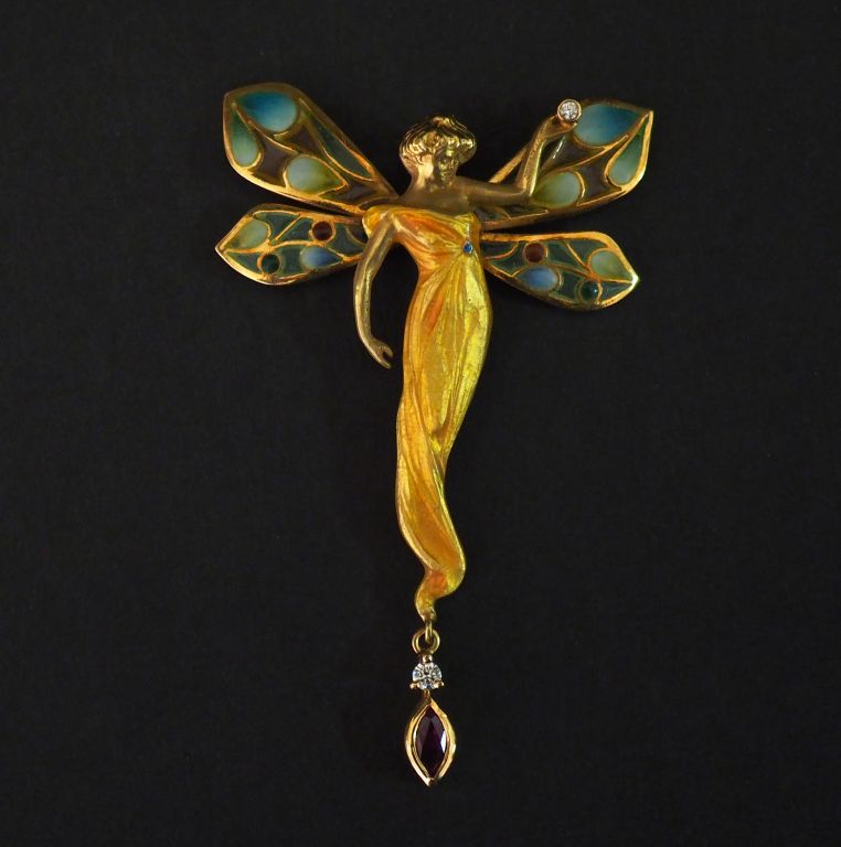 Pendentif de style Art Nouveau en or jaune, émail polychrome, diamants et pierre rose en pendeloque figurant une jeune femme ailée. 5,6 x 3,6 cm Poids tel. 9,93 g