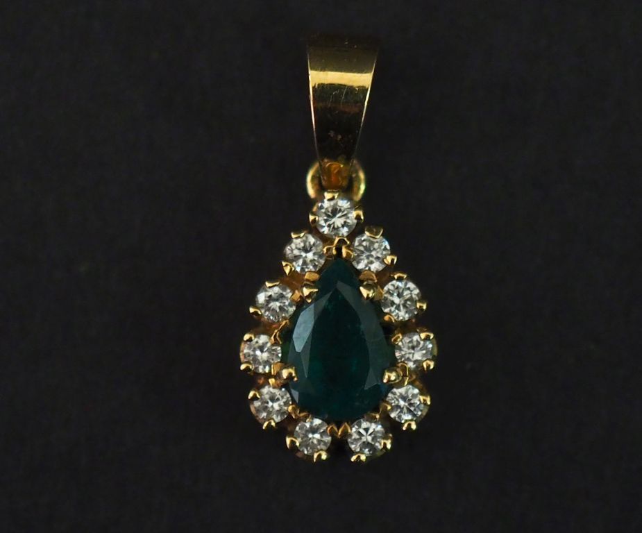 Pendentif en forme de goutte en or jaune 750, serti en son centre d'une émeraude entouré d'une couronne de petits diamants. 1,4 x 1 cm Poids tel. 2,42 g