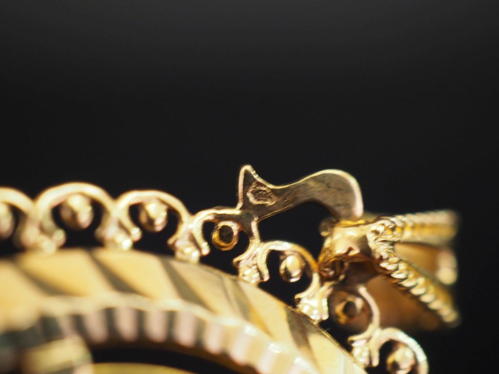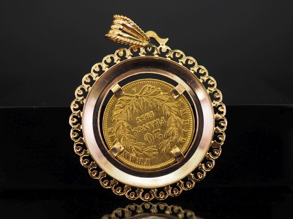 Pendentif en or jaune 750, serti en son centre d'une pièce de 20 Francs or, 1853-A. Joli pourtourt ajouré. Diam. 3,7 cm Poids. 10,66 g