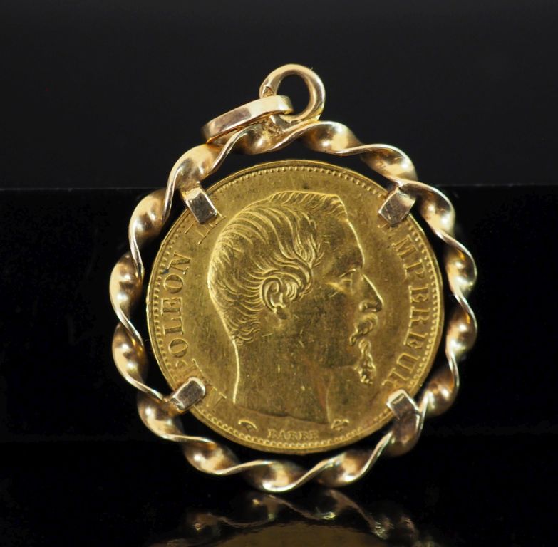 Pendentif en or jaune 750, serti en son centre d'une pièce de 20 Francs or 1859-A. Joli pourtour torsadé. Diam. 2,6 cm Poids. 8,67 g