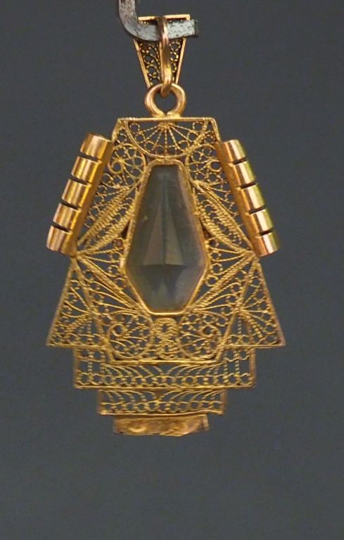 Pendentif en or jaune de forme géométrique à décor de filigranes, sertie en son centre d’un quartz. Long. 3 cm Poids tel. 4,03 g