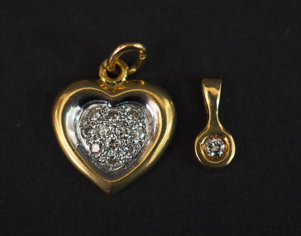 Pendentif en or jaune, en forme de cœur, serti d'un pavage de petits diamants. 1,4 x 1,4 cm On y joint un petit pendentif en or jaune, orné d'un petit diamant serti clos. H. 1 cm Poids tel. 2,33 g