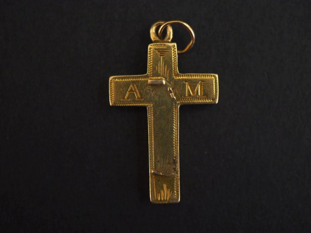 Pendentif en or jaune, en forme de crucifix. 2,5 x 1,7 cm Poids. 2,30 g (une partie à resouder)