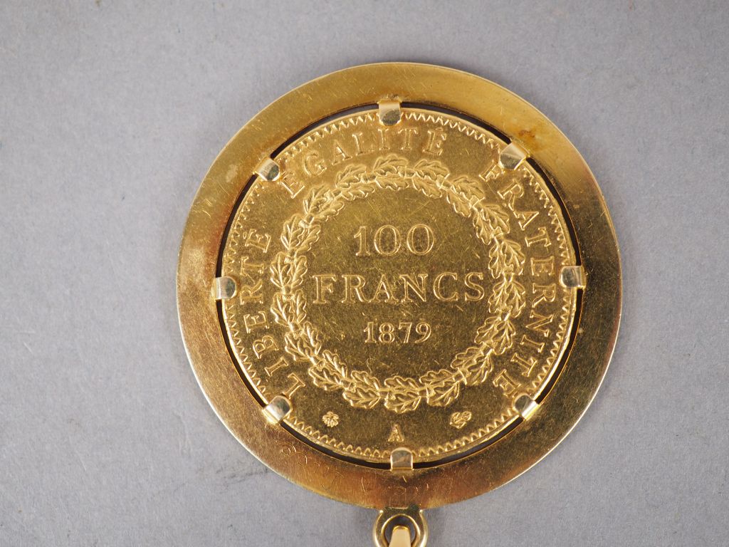 Pendentif en or jaune, orné d'une pièce de 100 Francs or, 1879-A. Poids. 41,75