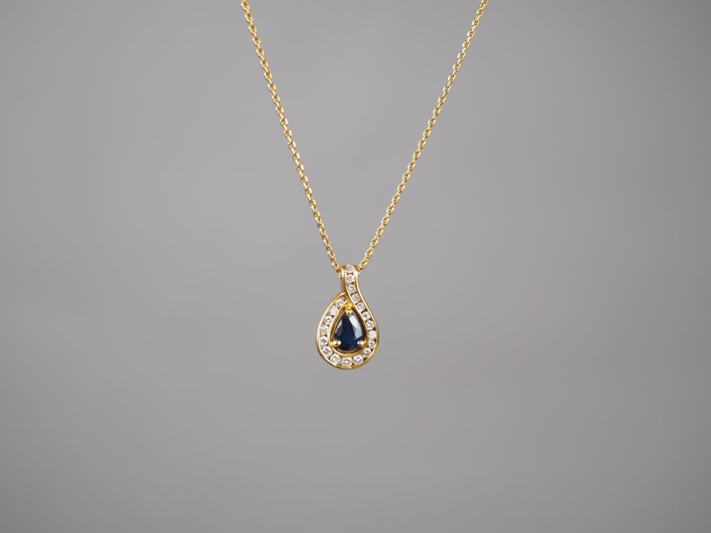 Pendentif en or jaune, saphir et diamants et sa chaine en or jaune. Poids tel.3,72 g