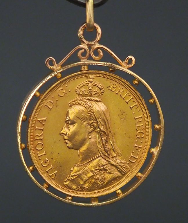 Pendentif en or jaune, serti en son centre d'une pièce d'une pièce or Reine Victoria, 1887. Diam. 3,4 cm Poids. 20,36 g