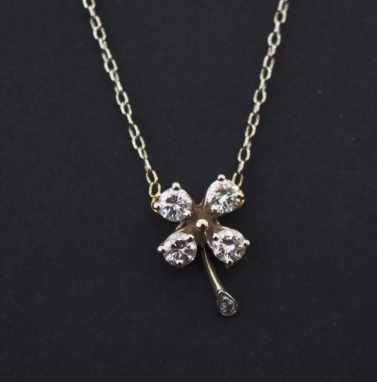 Pendentif et sa chaine en or blanc, en forme de trèfle à quatre feuilles, serti de diamants. Poids : 3,15 g