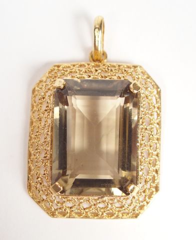 Pendentif monture ajourée en or jaune, ornée d'un quartz jaune-brun rectangulaire de 22ct environ. 3cm x 2,5cm Poids tel: 10,3gr