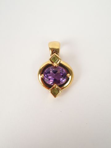 Pendentif monture or jaune, ornée d'une améthyste taille ovale facettée de 2,3cts environ épaulée de 2 petites pierres vertes taille princesse. 6,1gr tel