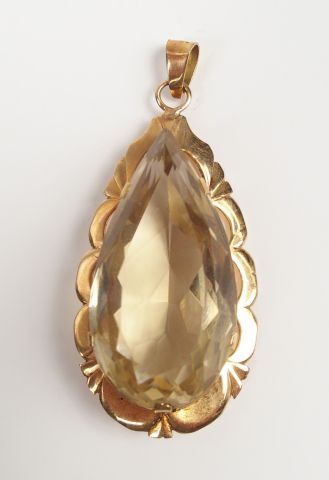 Pendentif monture or jaune travaillée orné d'une citrine taille poire de 35ct environ. 5cm Poids tel: 10,9gr