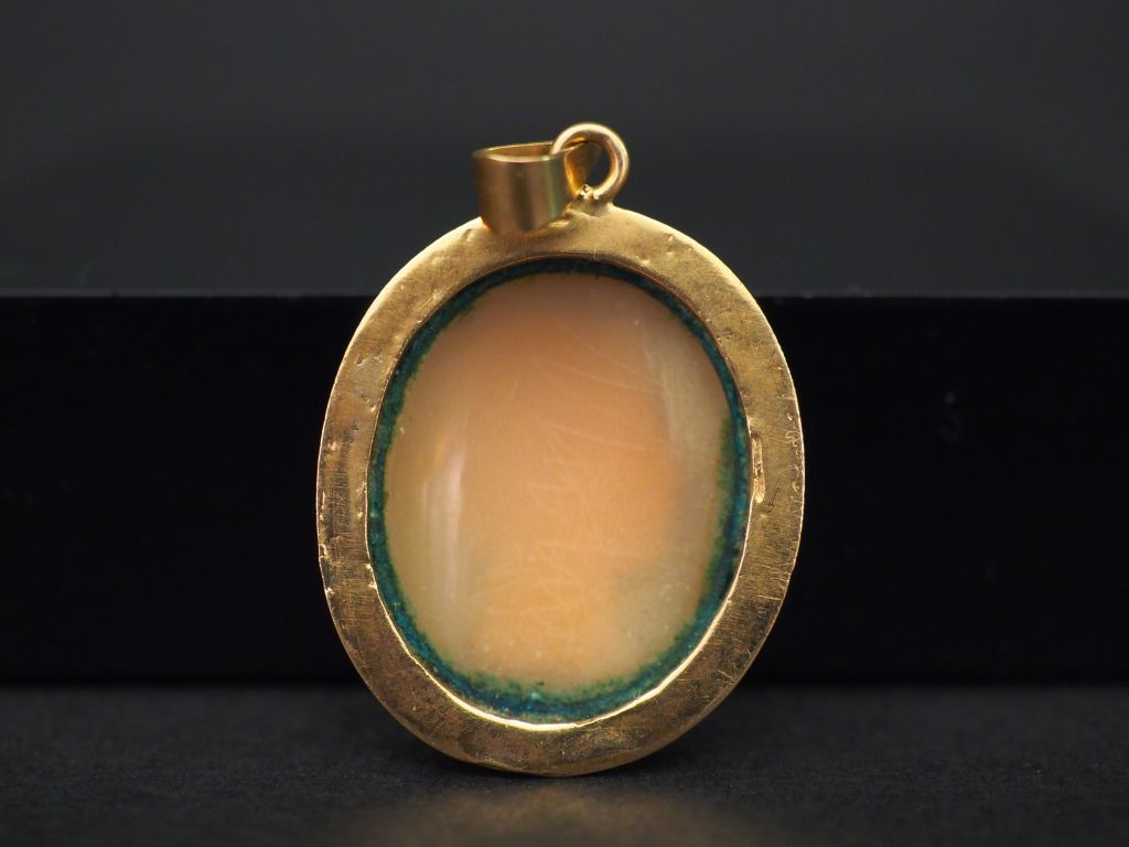 Pendentif Napoléon III en or jaune, serti en son centre d’un camée figurant une jeune femme au collier de perles. 2,7 x 2,3 cm Poids tel. 3,80 g