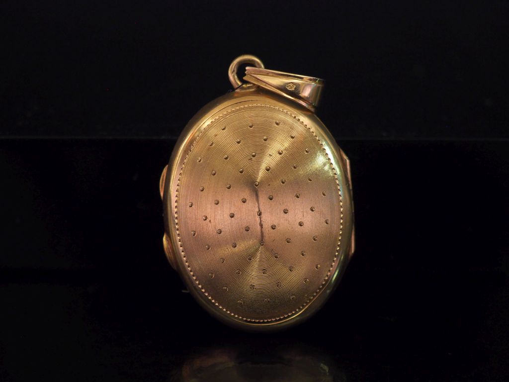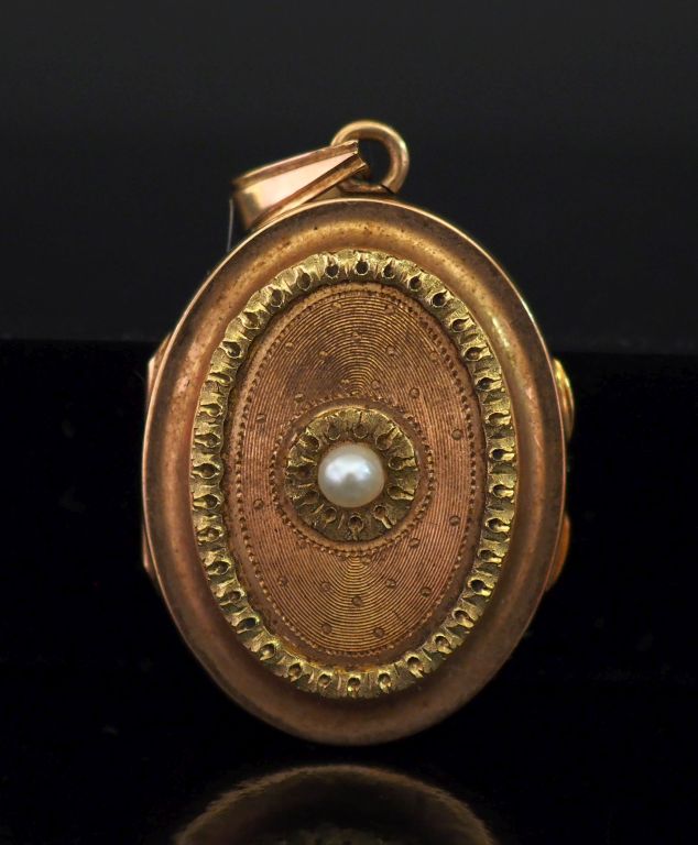 Pendentif porte-photo de forme ovale en or jaune 750, serti en son centre d'une petite perle blanche. Le revers, à décor de semi de pois. Verre à l'intérieur maintenant une mèche de cheveux. 3 x 2,5 cm (sans la bélière) Poids tel. 8,27 g