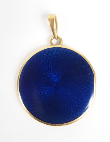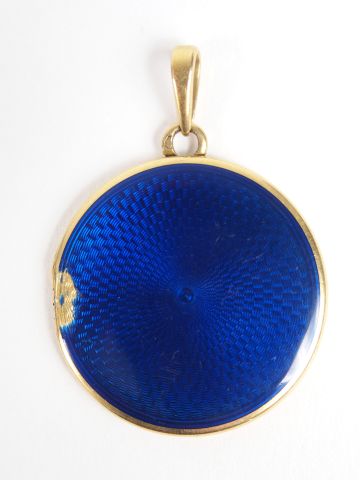 Pendentif porte-photo monture or jaune, émail bleu (sauts). Diam. : 24mm Poids tel: 8,9gr