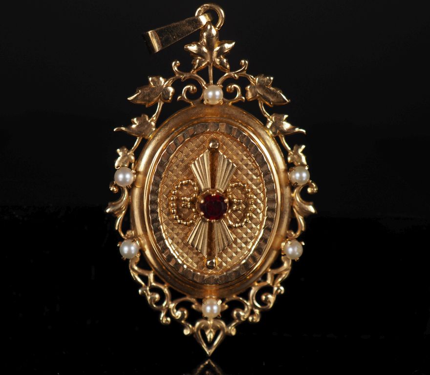 Pendentif porte photo Napoléon III en or 750, perles et grenat, à décor ajouré de feuillage et de gerbes Poids tel : 9,30 g