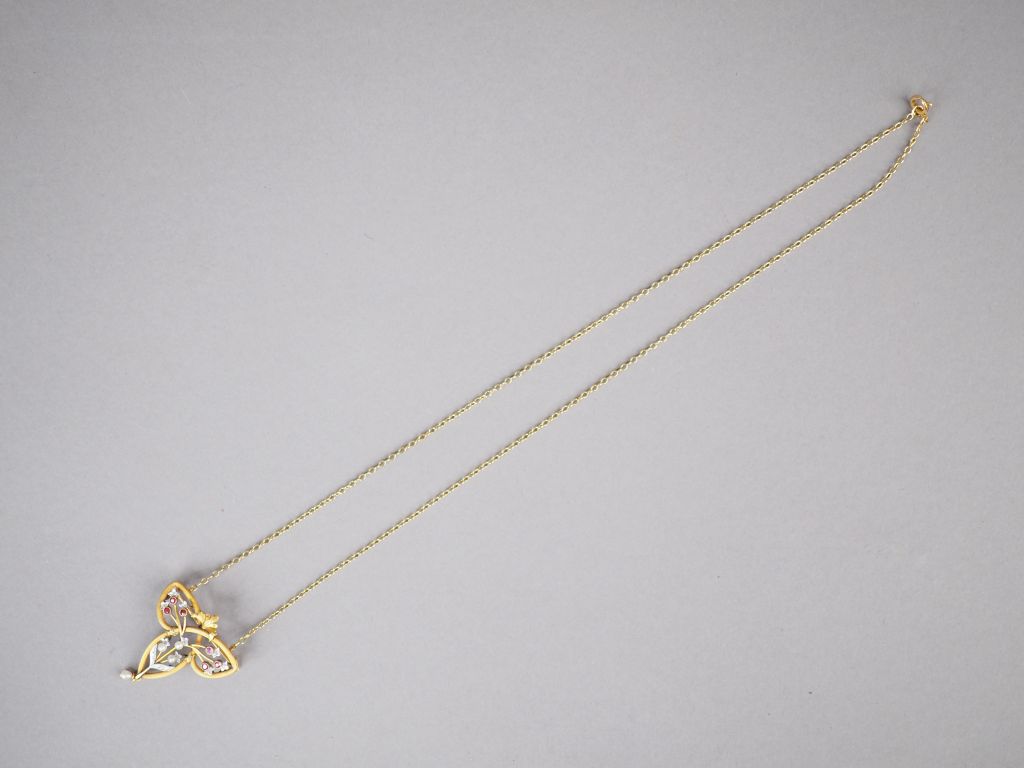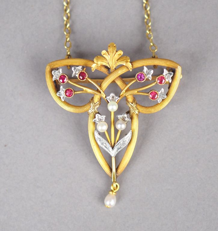 Pendentif transformable en broche de style Art Nouveau en or jaune, éclats de diamants, perles et pierres roses, à décor ajouré de branchage fleuri. Poids tel. 6,94 g