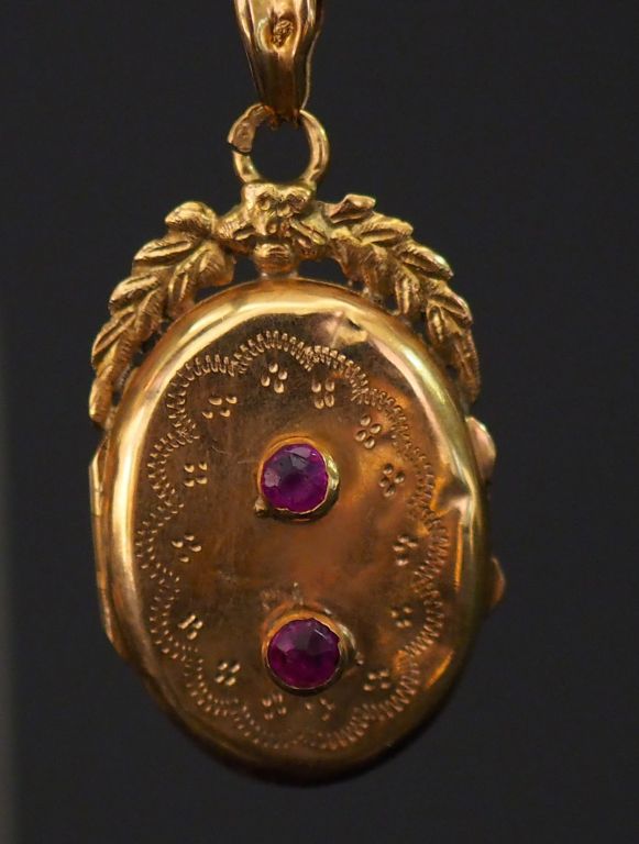 Petit pendentif Napoléon III en or jaune, à décor de feuillage, de cartouche et de petites pierres roses. H. 2,3 cm Poids tel. 1,52 g (bélière légèrement accidentée))