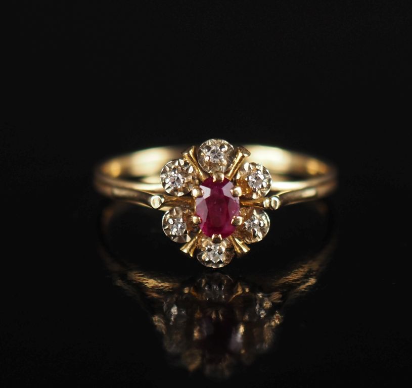 Petite bague de forme marguerite en or jaune 750, sertie en son centre d'une pierre rouge entourée d'une couronne de pierres à l'imitation du diamant. TDD. 55 Poids tel. 2,17 g