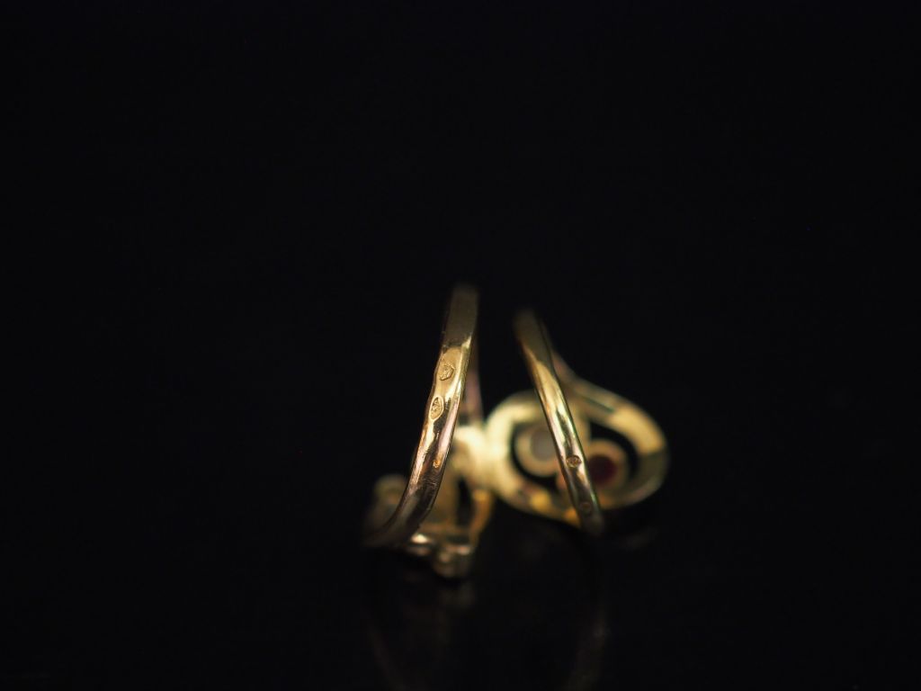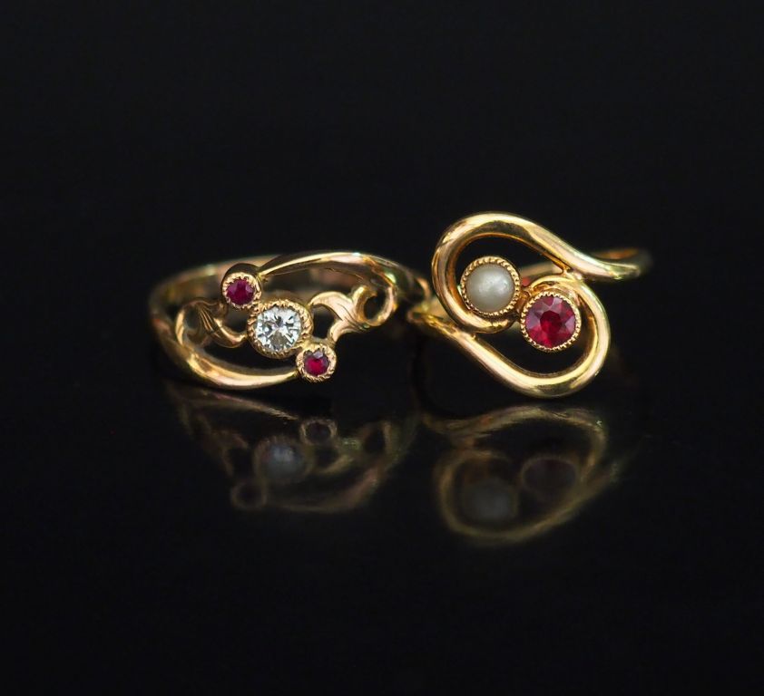 Petite bague en or jaune de forme mouvementée et ajourée, sertie d'une perle blanche et d'une pierre rose. TDD. 50 On y joint une bague en or jaune, à décor ajouré et sertie d'un petit diamant et de deux pierres roses. TDD. 56 Poids tel. 4,18 g