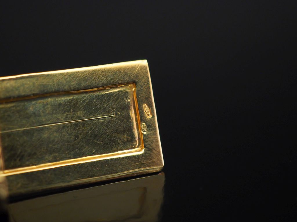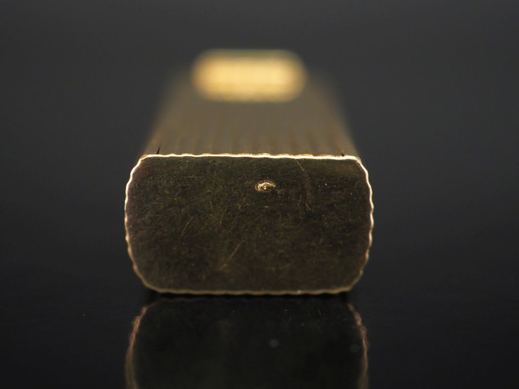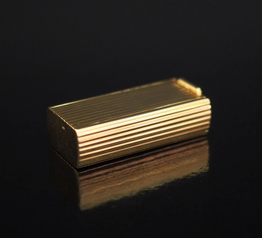 Petite boite à pilules rectangulaire en or jaune, à décor de godrons. Ouverture coulissante. 1,1 x 2,7 x 1,8 cm Poids. 12,49 g