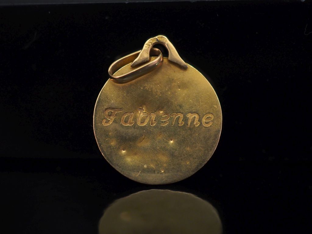 Petite médaille religieuse en or jaune, figurant la Sainte Vierge de profil. Diam. 1,5 cm Poids. 1,19 g (gravée, petits enfoncements)