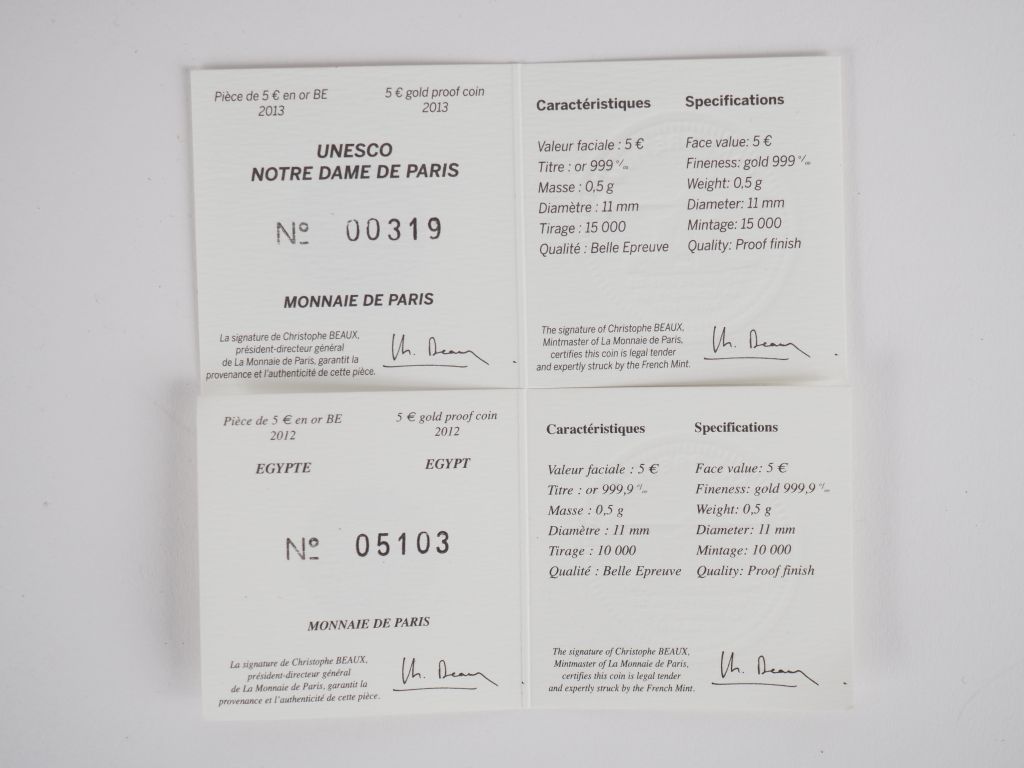 Pièce de 5 euros Egypte 2012 en or 999, monnaie de Paris, dans son écrin. Poids.0,5 g. On y joint une pièce de 5 euros 2013 Unesco 850 de Notre Dame de Paris en or 999. Poids. 0,5 g.