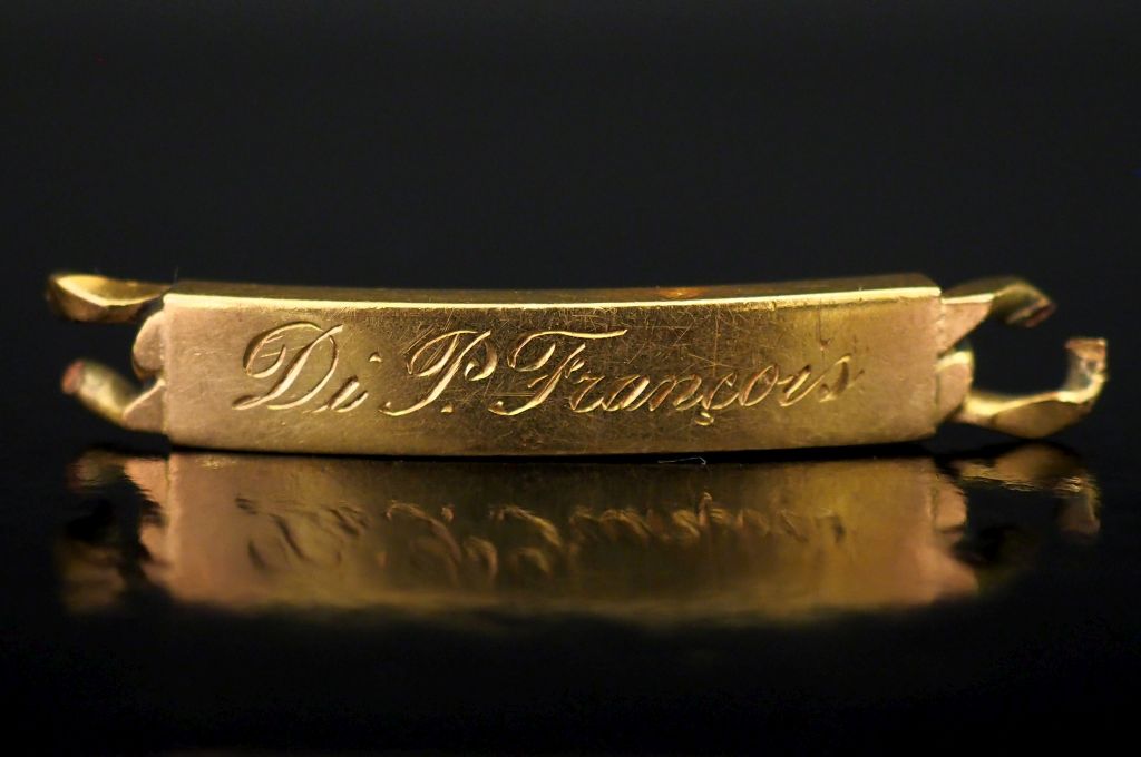 Plaque de gourmette en or jaune 750. Gravée. Long. 5 cm Poids. 8,42 g (accidentée)
