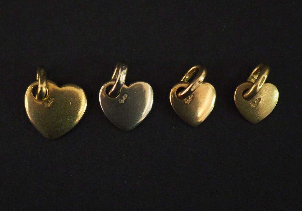 POMELLATO Suite de quatre pendentifs en or jaune, blanc et rose en forme de cœur. H. 1 cm, 0,9 cm, 0,8 cmet 0,7 cm Signés. Poids. 6,38 g