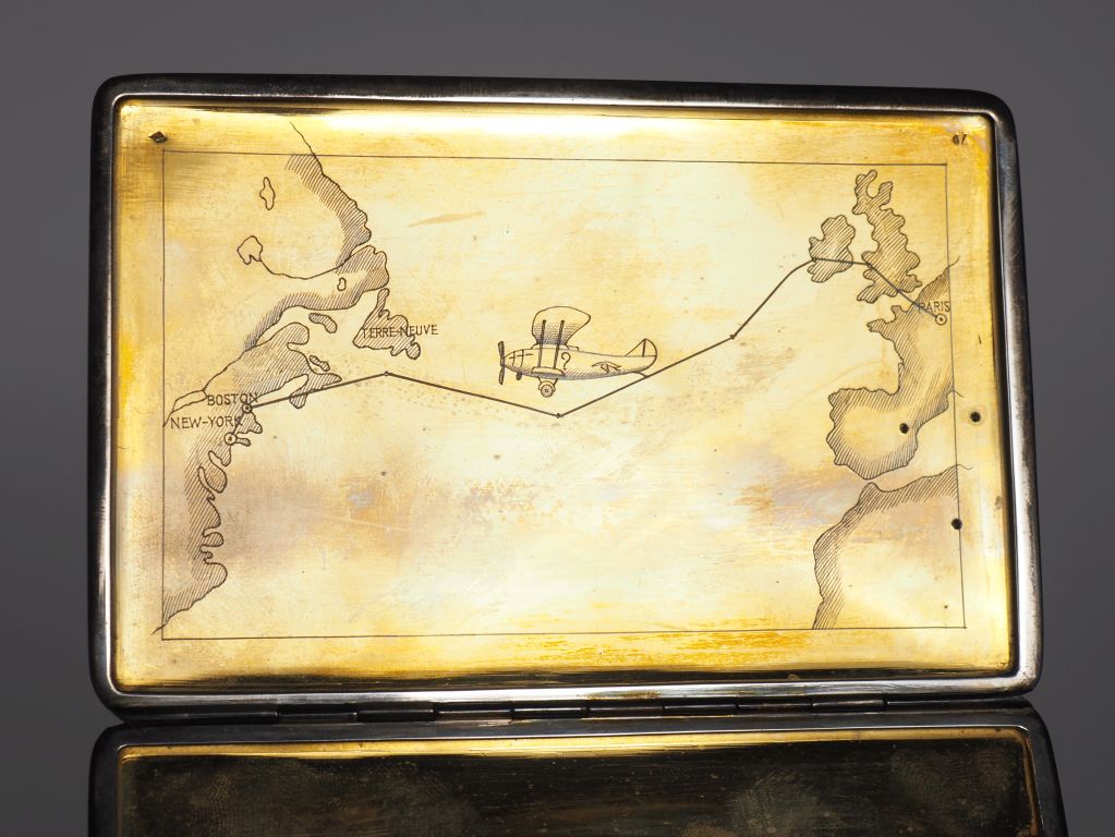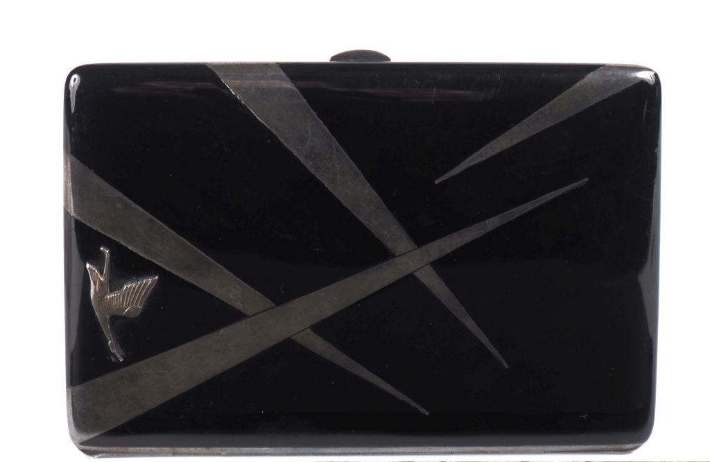 Porte cigarettes Art Déco en laque, argent et vermeil. Le couvercle orné de la cigogne, symbole de la marque Hispano Suiza, en vol agrémenté de cinq faisceaux. L'intérieur est finement gravé d'une représentation du vol Paris New-York réalisé par Costes et Bellonte à bord du point d'interrogation. Poids tel : 16 g Dim. 12,5 x 8,5 cm