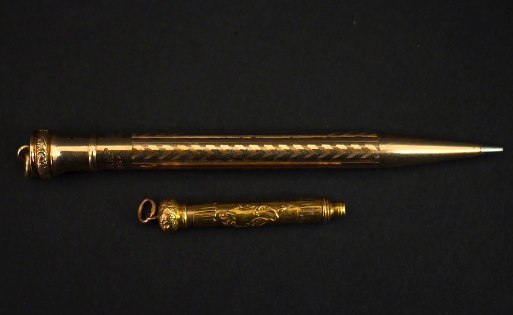 Porte-mine de style Louis XV en or jaune 750, à décor de cartouche. Long. 4 cm Poids tel. 5,79 g (petits enfoncements) On y joint un porte-mines Wahl Ever Sharp en plaqué or. Long. 10,4 cm