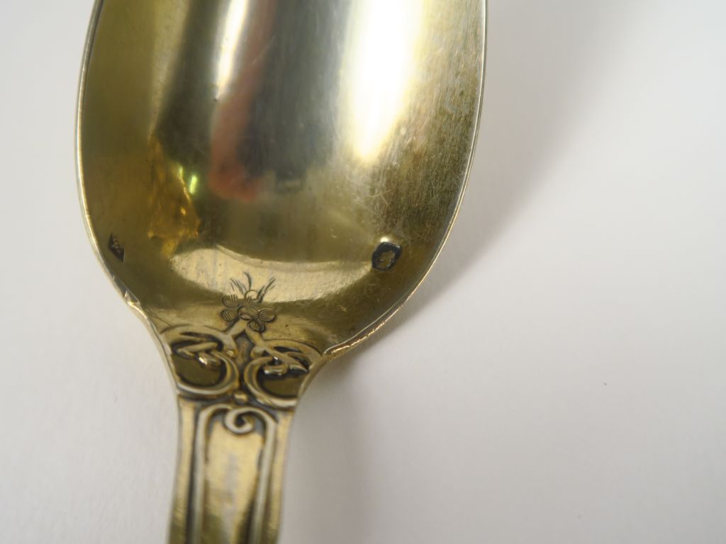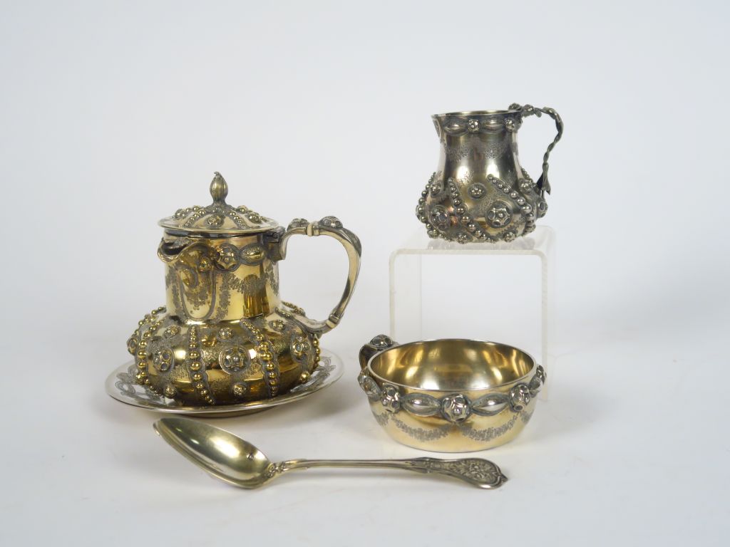 Service égoïste en argent et vermeil poinçon Minerve, à décor de cabochons et de motifs feuillagés. Poids. 974 gr
